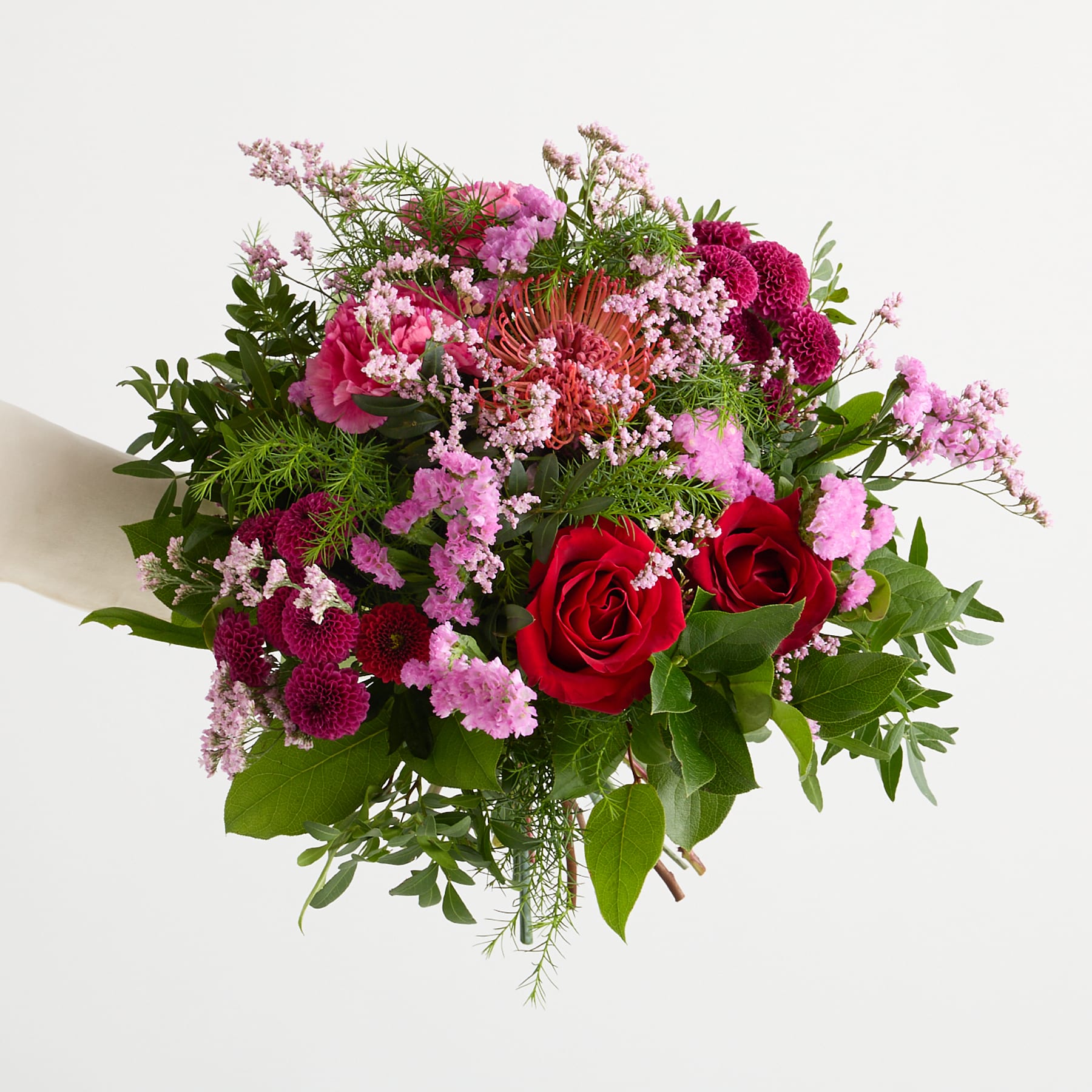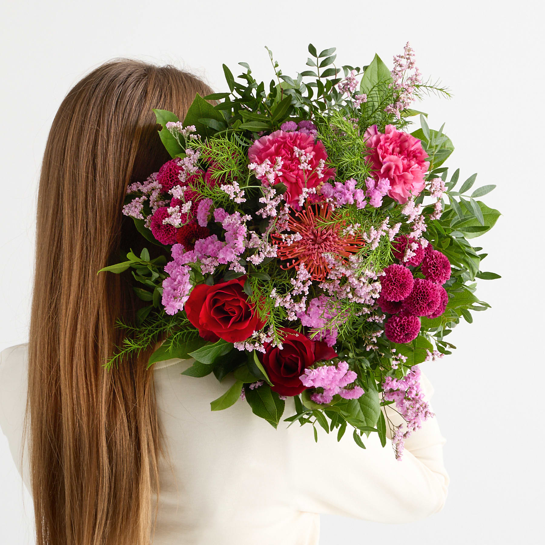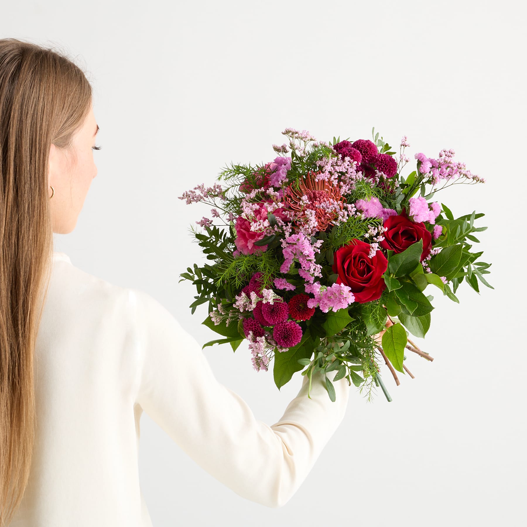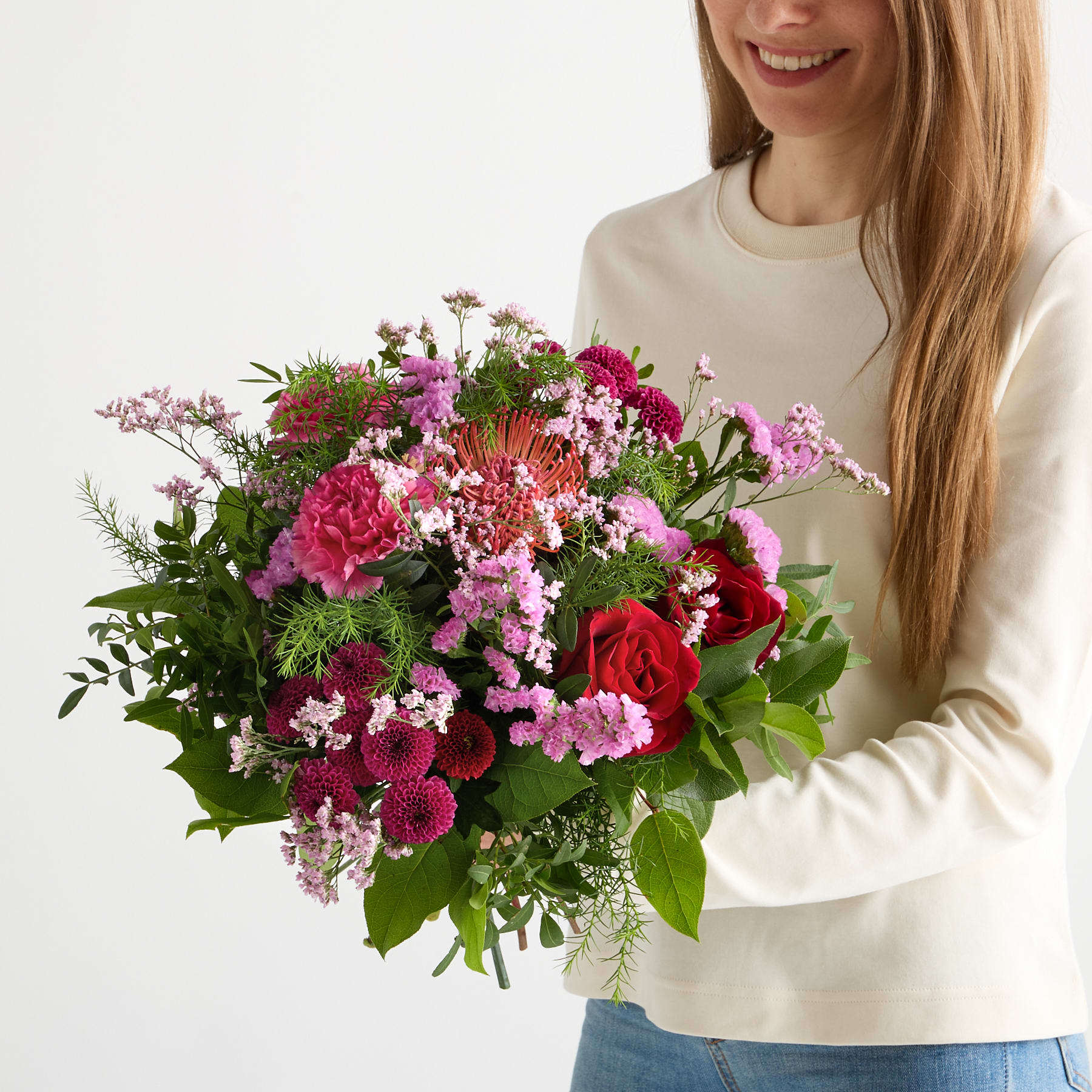 Holiday Harmony – ein festlicher Blumenstrauß, der die Wärme und Geborgenheit der Weihnachtszeit einfängt. Leuchtende Rosen und Nelken vereinen sich mit zarten Chrysanthemen zu einem harmonischen Farbenspiel, das Herz und Seele berührt. Die außergewöhnliche Nadelkissen-Protea setzt eindrucksvolle Akzente, während Sicheltanne, Pistazie und Salal den Strauß in ein sanft duftendes Winterkleid hüllen. Feines Limonium verleiht ihm einen Hauch Leichtigkeit – wie glitzernder Raureif im Morgenlicht.