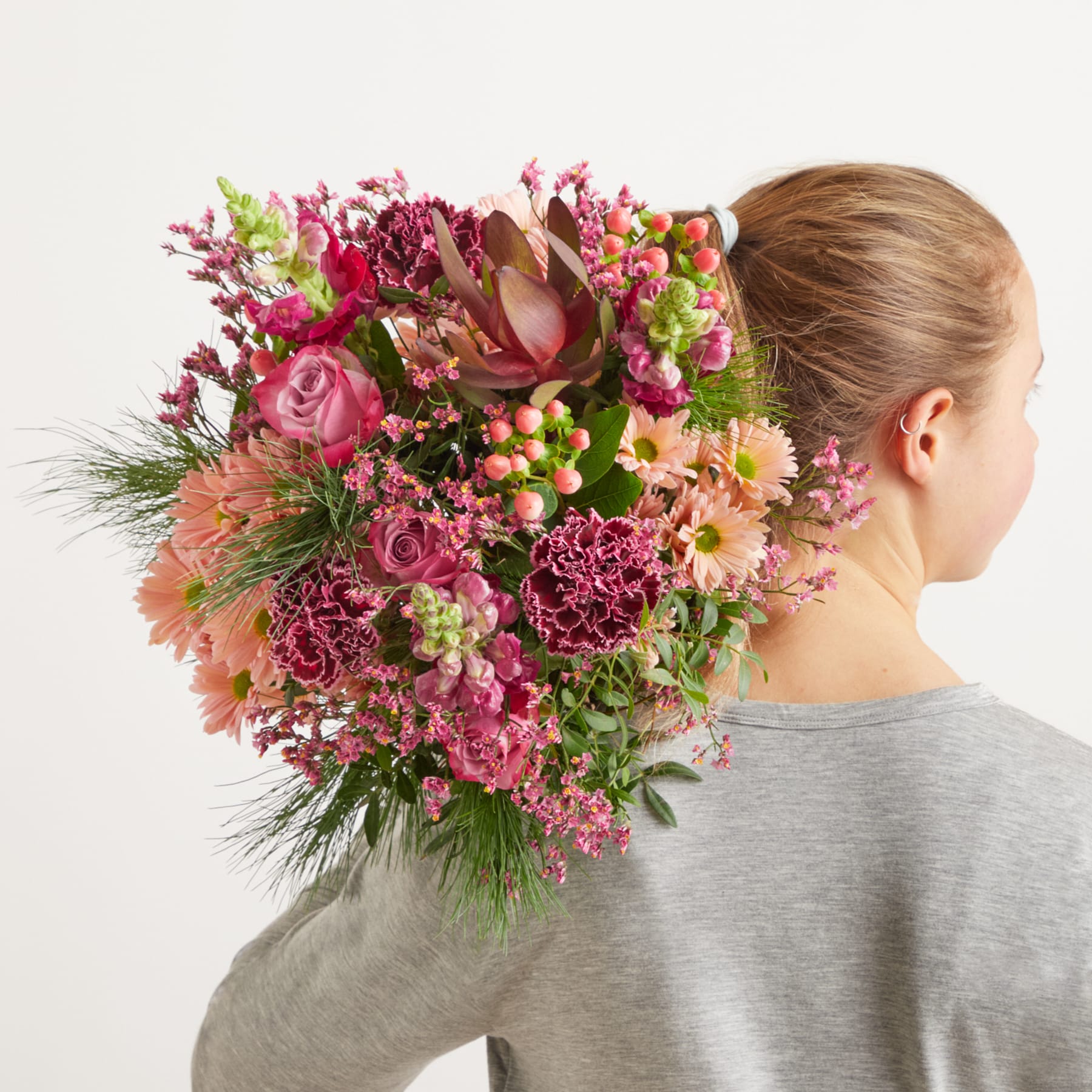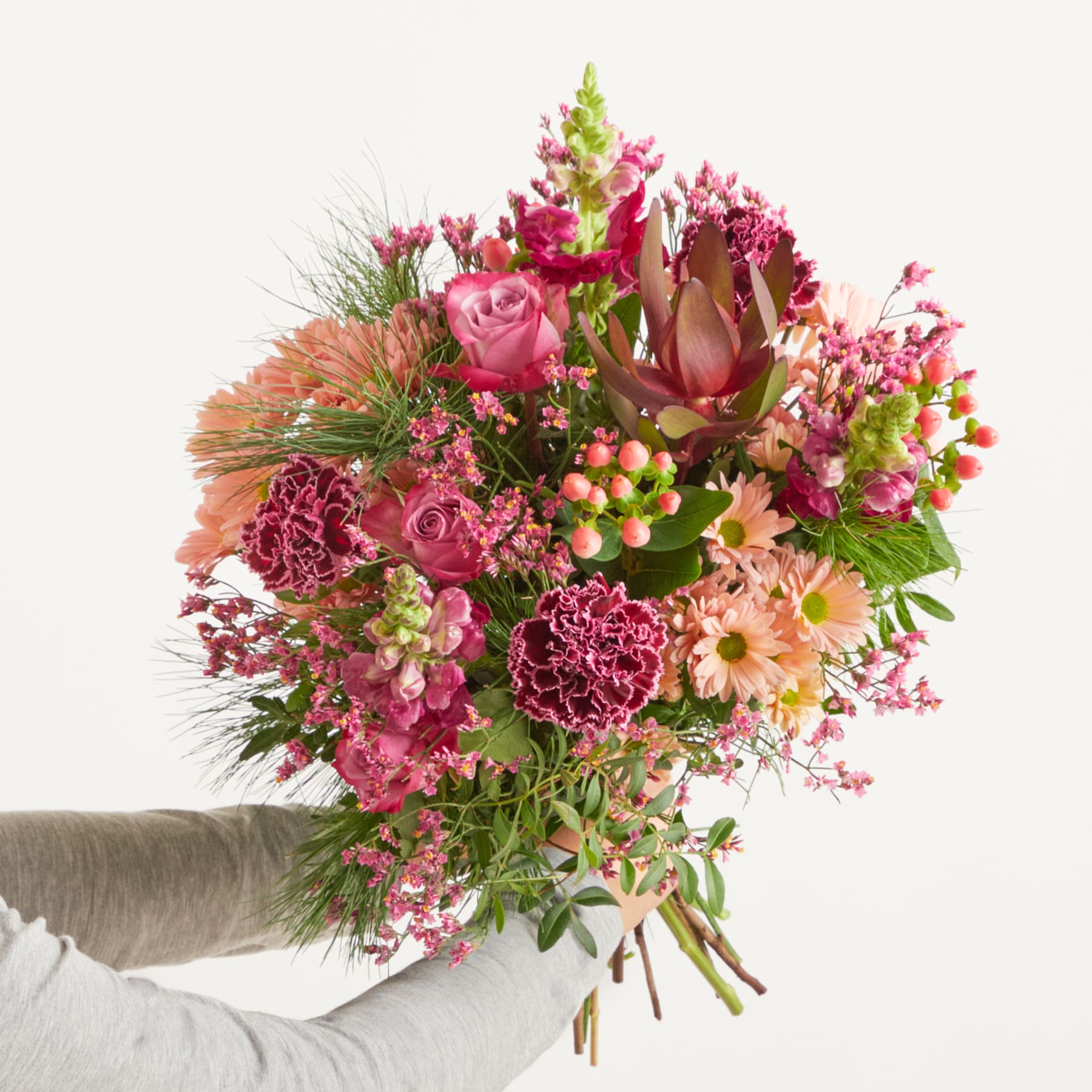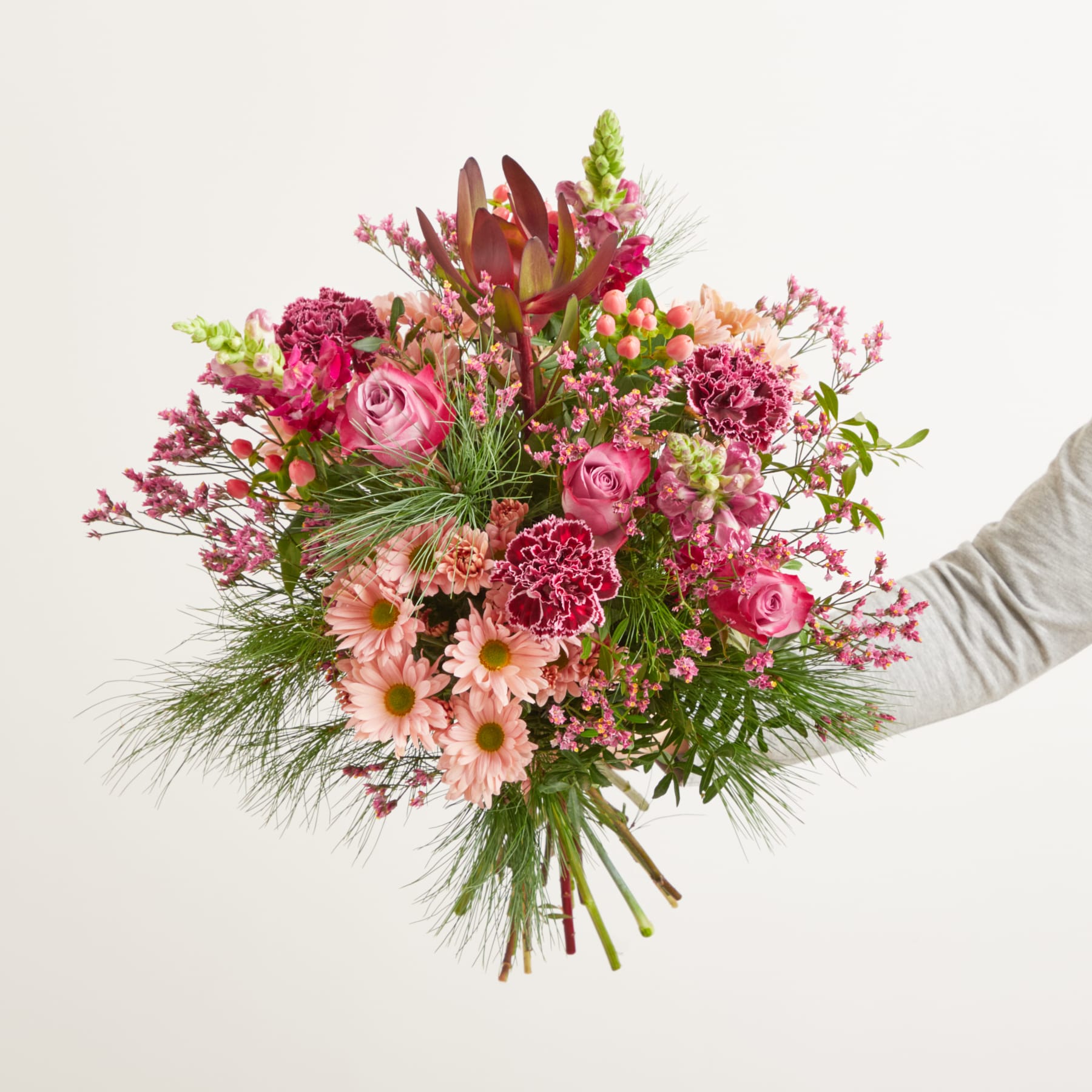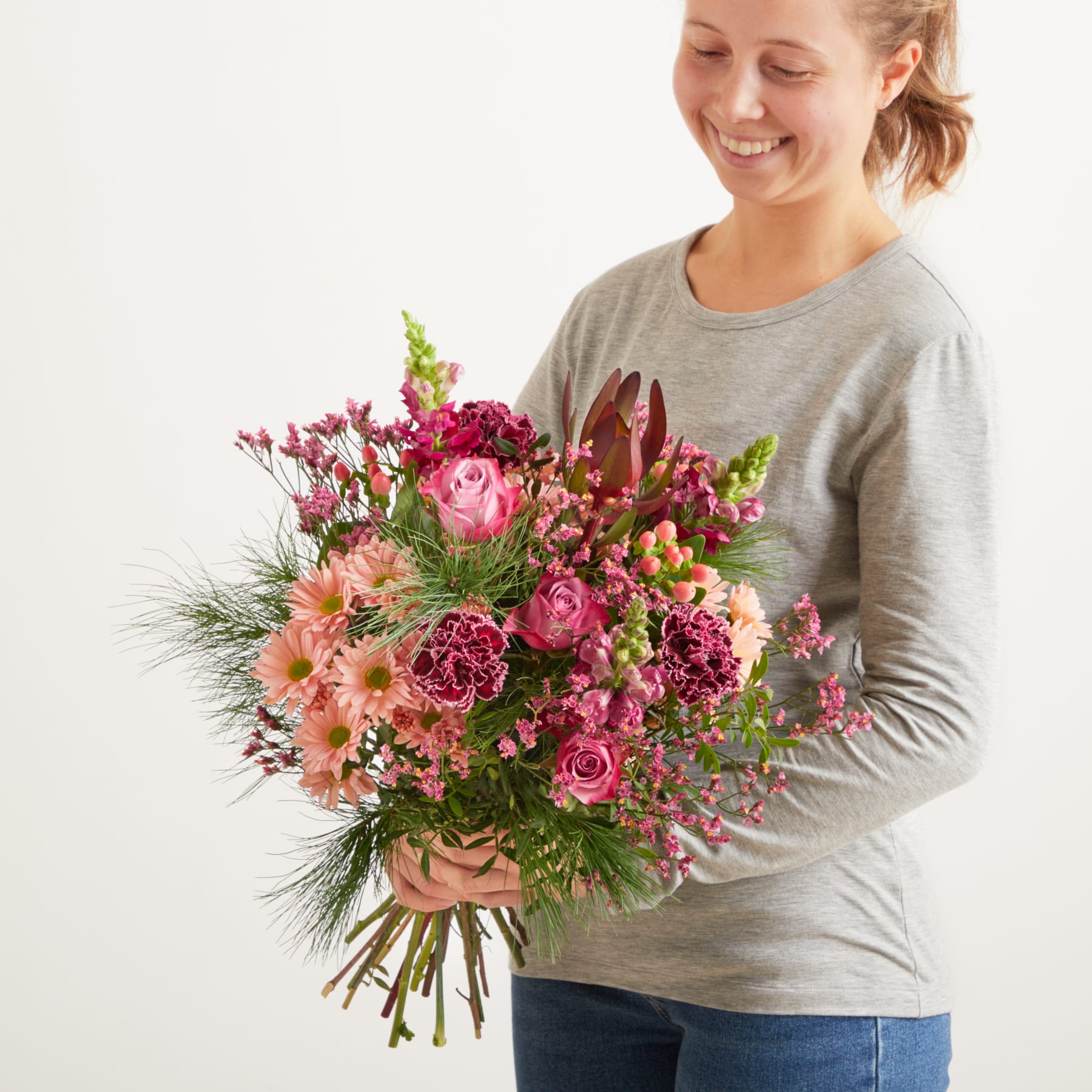 Wintermärchen – ein Wiesenblumenstrauß wie aus einem zauberhaften Wintertraum. Zarte Rosen und Nelken vereinen sich mit filigranem Löwenmaul und Chrysanthemen zu einem Arrangement voller Eleganz und Wärme. Edles Leucadendron und feines Limonium bringen winterliche Struktur, während duftendes Kieferngrün und Pistazie an Spaziergänge durch verschneite Wälder erinnern. Kleine Beeren des Johanniskrauts setzen leuchtende Akzente – wie winzige Glanzpunkte im Kerzenlicht. Ein liebevoll zusammengestellter Strauß, der Herz und Sinne berührt und die Magie der Weihnachtszeit in jedes Zuhause bringt – perfekt, um deinen Liebsten Freude, Geborgenheit und winterliche Träumerei zu schenken.