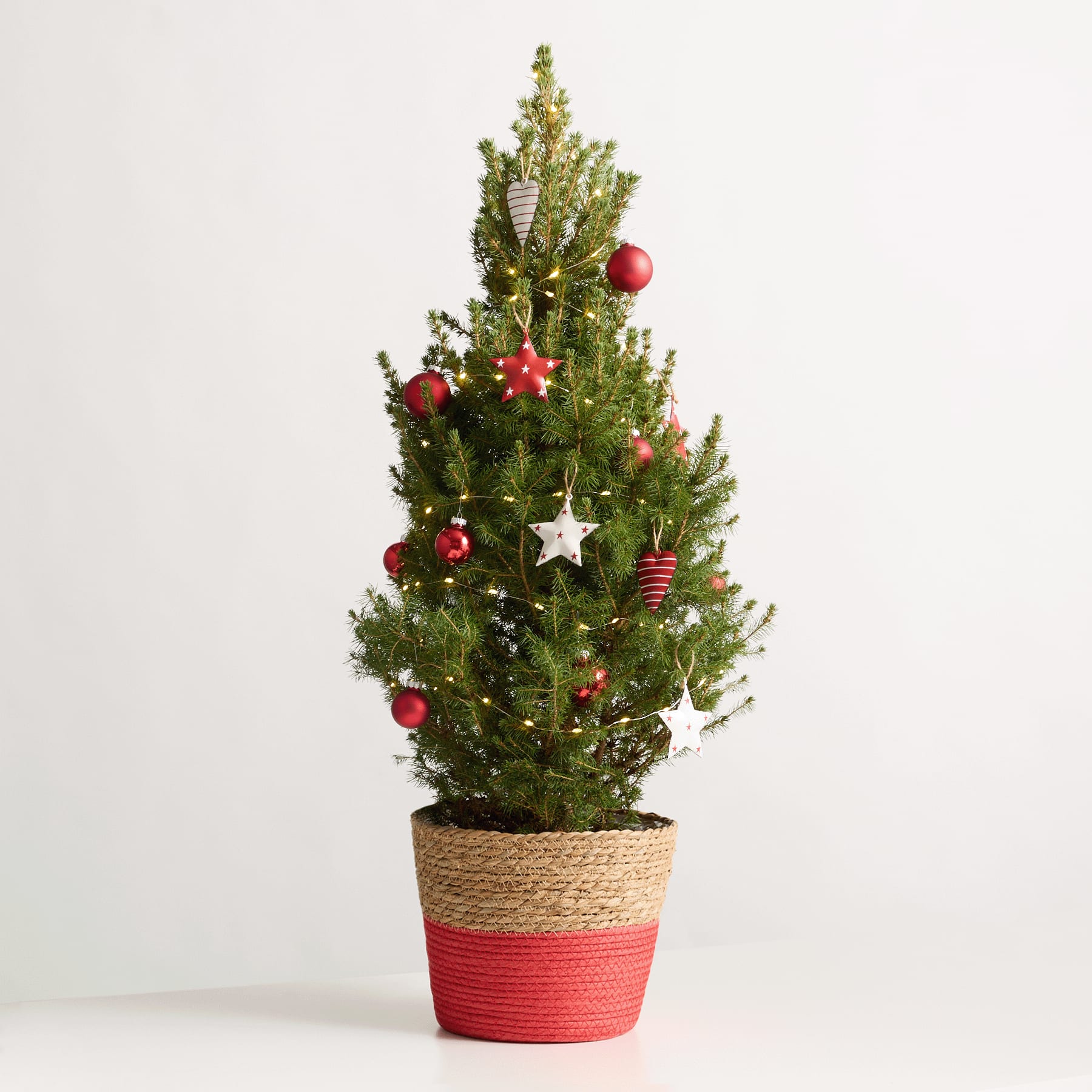 Was wäre das Weihnachtsfest ohne einen reich geschmückten Tannenbaum? Unser Bäumchen Weihnachtsabend sorgt für Gemütlichkeit im Kreis der Familie. Du musst nur den Schmuck und die Lichterkette anbringen – schon erstrahlt er in festlichem Glanz. Die Höhe der Fichte liegt bei ca. 75 cm, der Topfdurchmesser beträgt ca. 23 cm und Du erhältst das Bäumchen in einem naturfarbenen Korb aus Seegras. Der Schmuck besteht aus 12 roten Christbaumkugeln, 8 Anhängern aus Metall (4x Herz, 4x Stern). Für die stimmungsvolle Beleuchtung sorgen 100 LEDs. Stelle den Tannenbaum nicht direkt vor die Heizung und halte den Erdbereich gleichmäßig feucht. Besonders wohl fühlt er sich im Hauseingang oder in deinem Wohnzimmer. Ein hübscher Anblick in dieser wundervollen, besinnlichen Zeit.