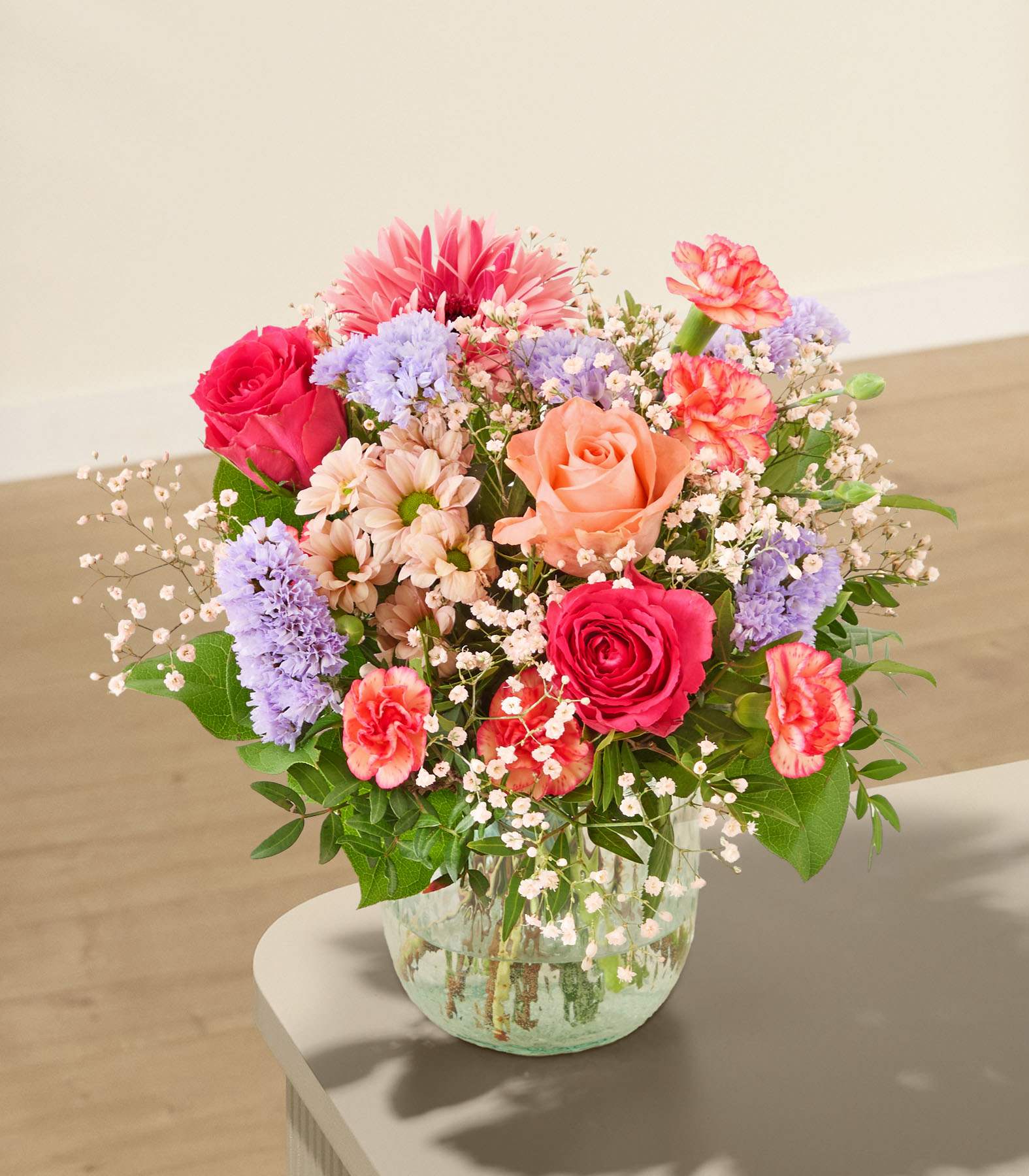 Natürlich, frisch und ungezwungen – dieser Blumenstrauß feiert die Schönheit des Einfachen. Im Mittelpunkt stehen Chrysanthemen, die für Langlebigkeit und Zuversicht bekannt sind. Ihre kräftigen Blütenköpfe verleihen dem Bund Struktur und Halt. Gerbera und Rosen bringen Farbe ins Spiel, während Schleierkraut und Limonium für Leichtigkeit sorgen. Mit einer Stiellänge von ca. 35 cm eignet sich dieser Bund ideal zum Verschenken. Chrysanthemen halten besonders lange frisch – perfekt für alle, die sich dauerhaft am Frühling erfreuen möchten. Ein Bund, der Raum für Kreativität lässt.